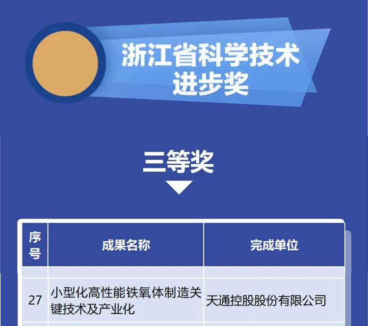 在7月11日下午召開的全省科技創新大會上,2021年度“浙江省科學技術進步獎”等一系列獎項揭曉,天通控股股份有限公司“小型化高性能鐵氧體制造關鍵技術及產業化”項目榮獲浙江省科學技術進步獎三等獎。這是天通公司磁性材料第八次獲得浙江省科學技術進步獎。